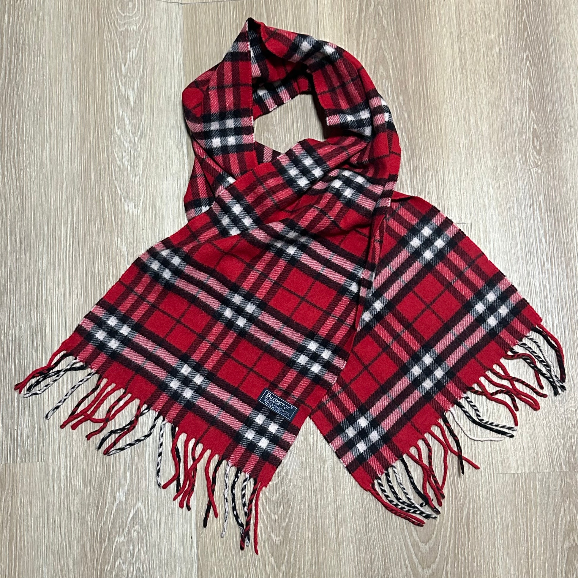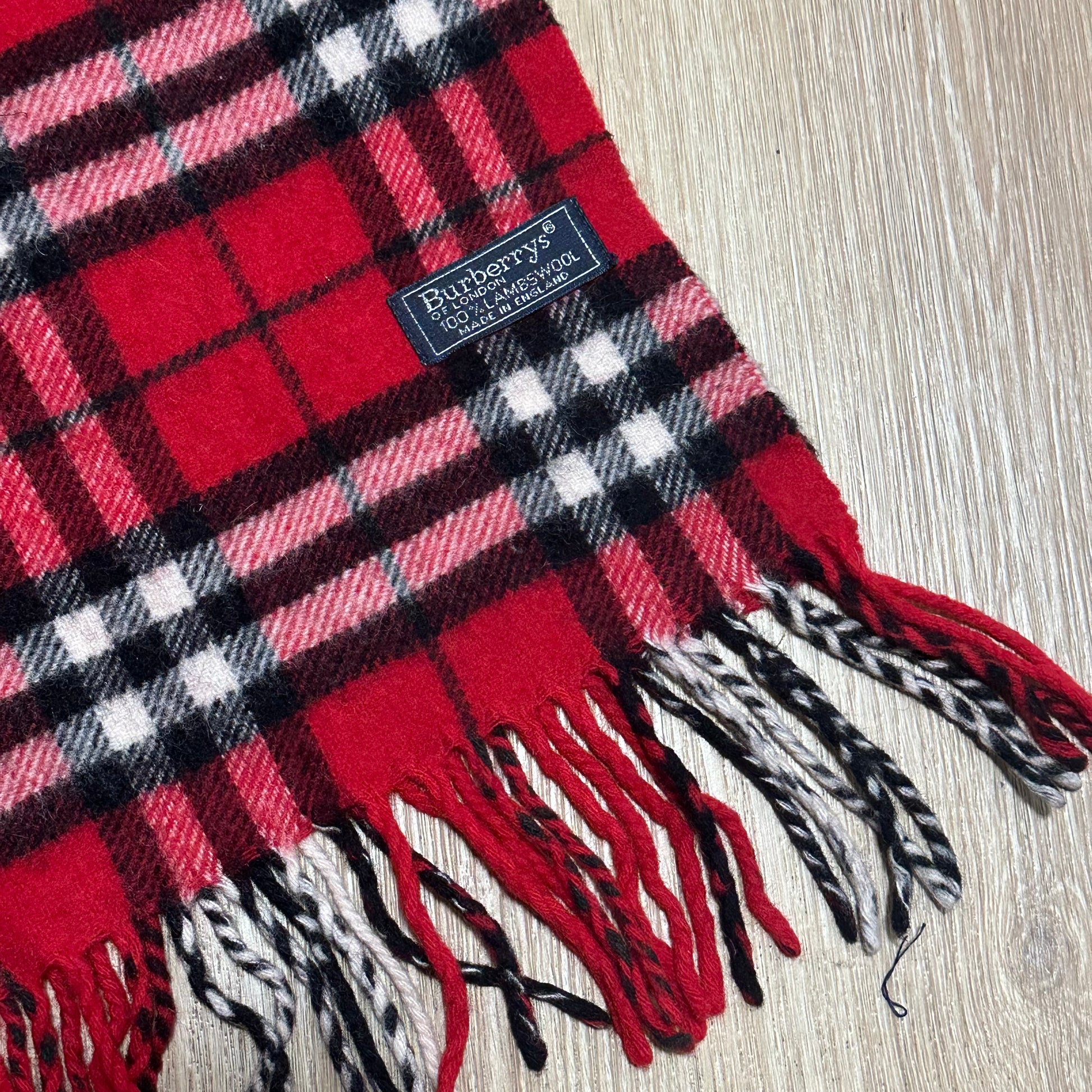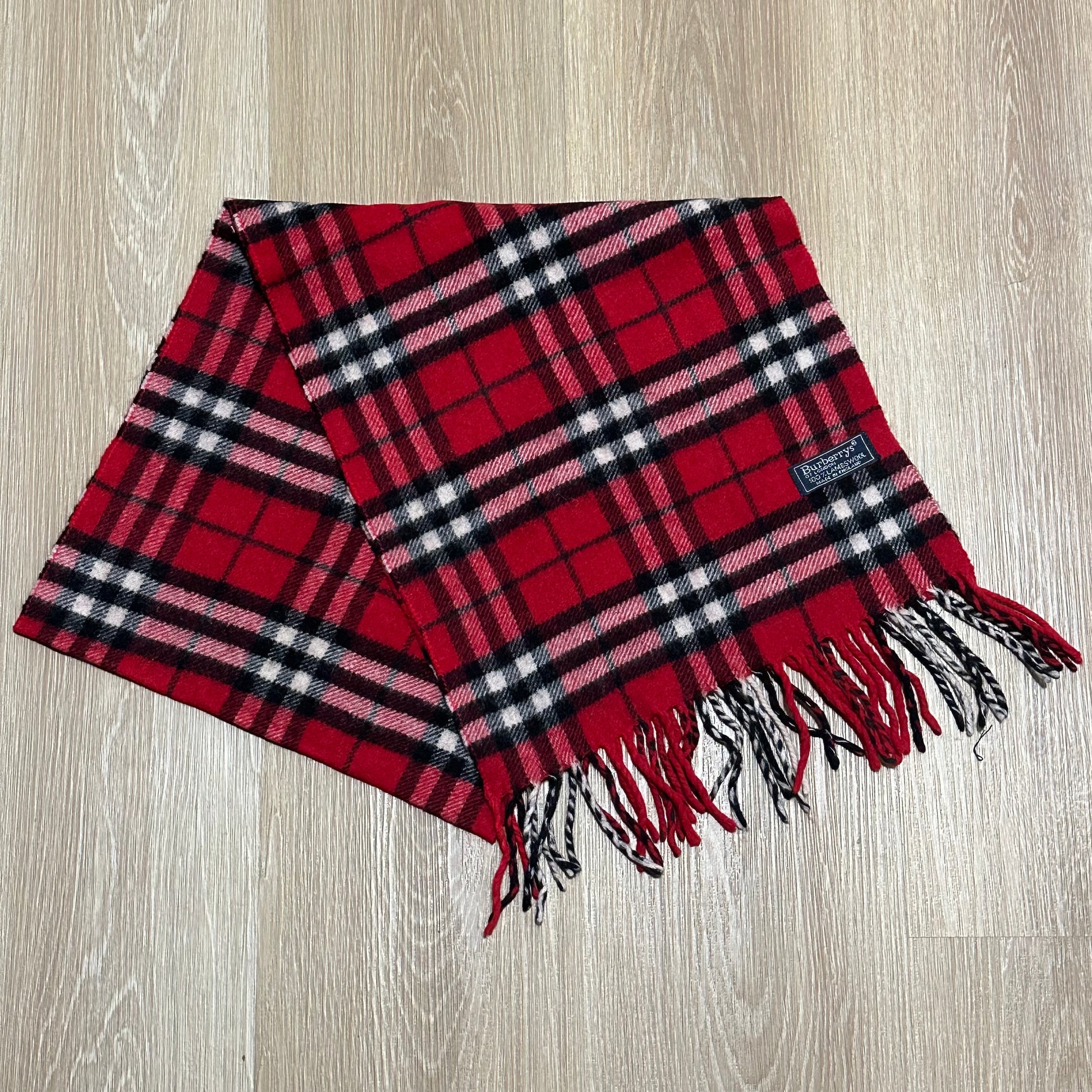Vintage 90's Burberry Scarf is red, wool, and rectangular. This is a vintage, pre-owned item with basic wear and fade. Please refer to the pictures and size measurements.