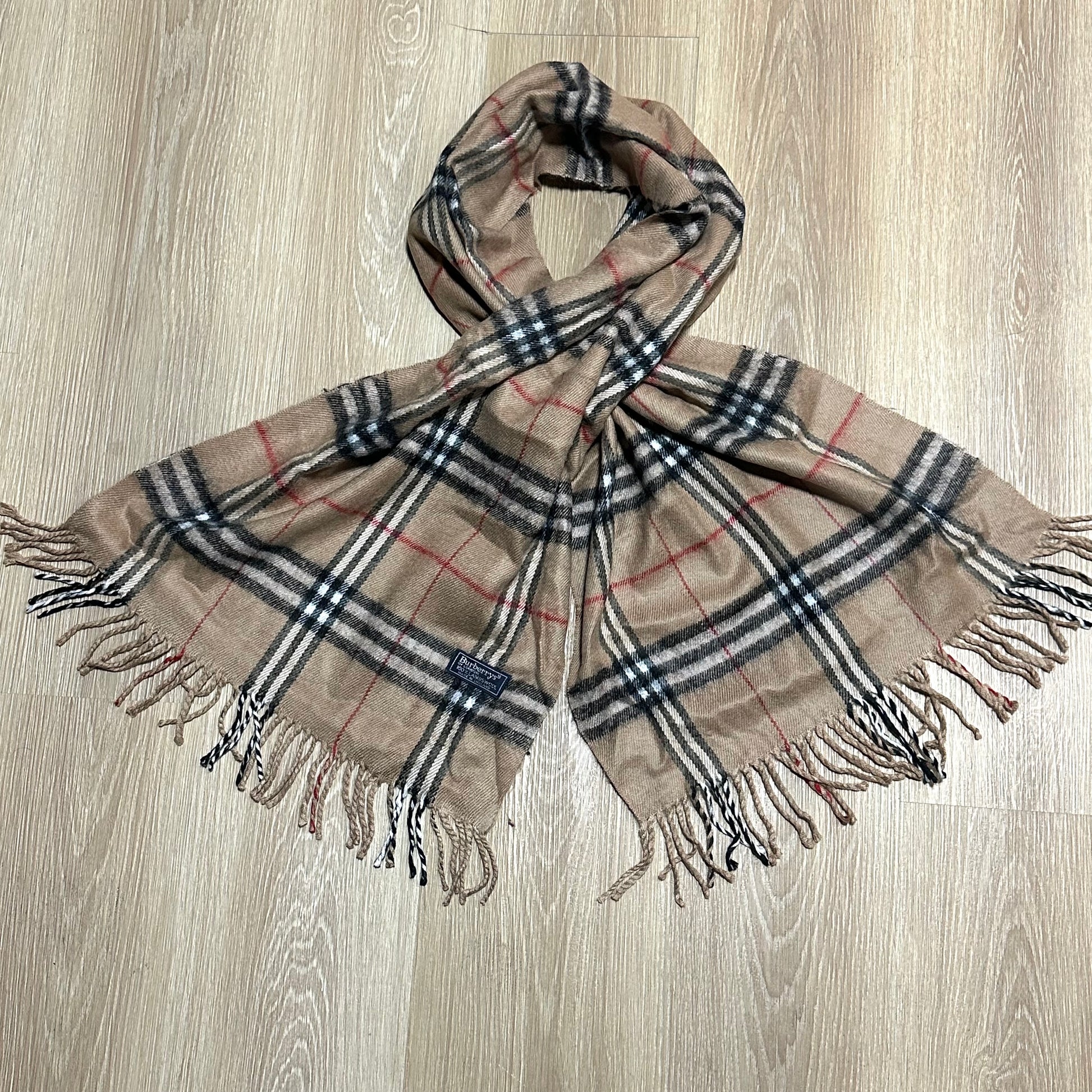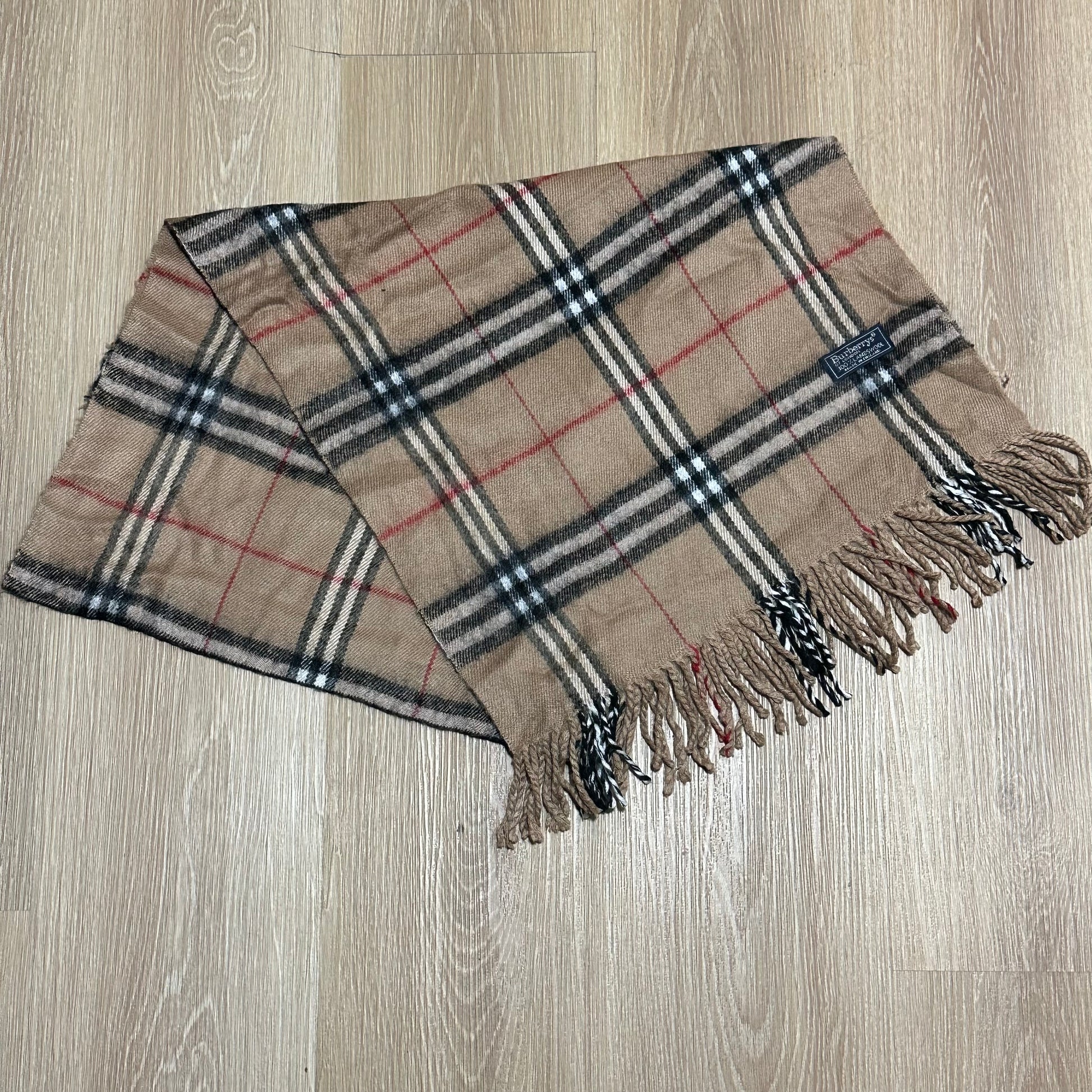 Vintage 90's Burberry Scarf is tan Nova Check, wool, and rectangular. This is a vintage, pre-owned item with basic wear and fade. Please refer to the pictures and size measurements.
