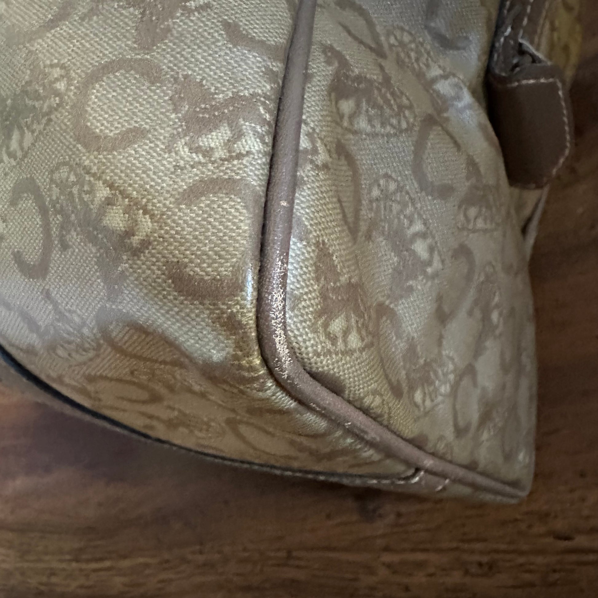 PLEASE NOTE: There is some discoloration throughout the coated canvas, slight corner wear, and some wear to the handles (refer to pics). This is a vintage, pre-owned item with basic wear and fade. Please refer to the pictures and size measurements.