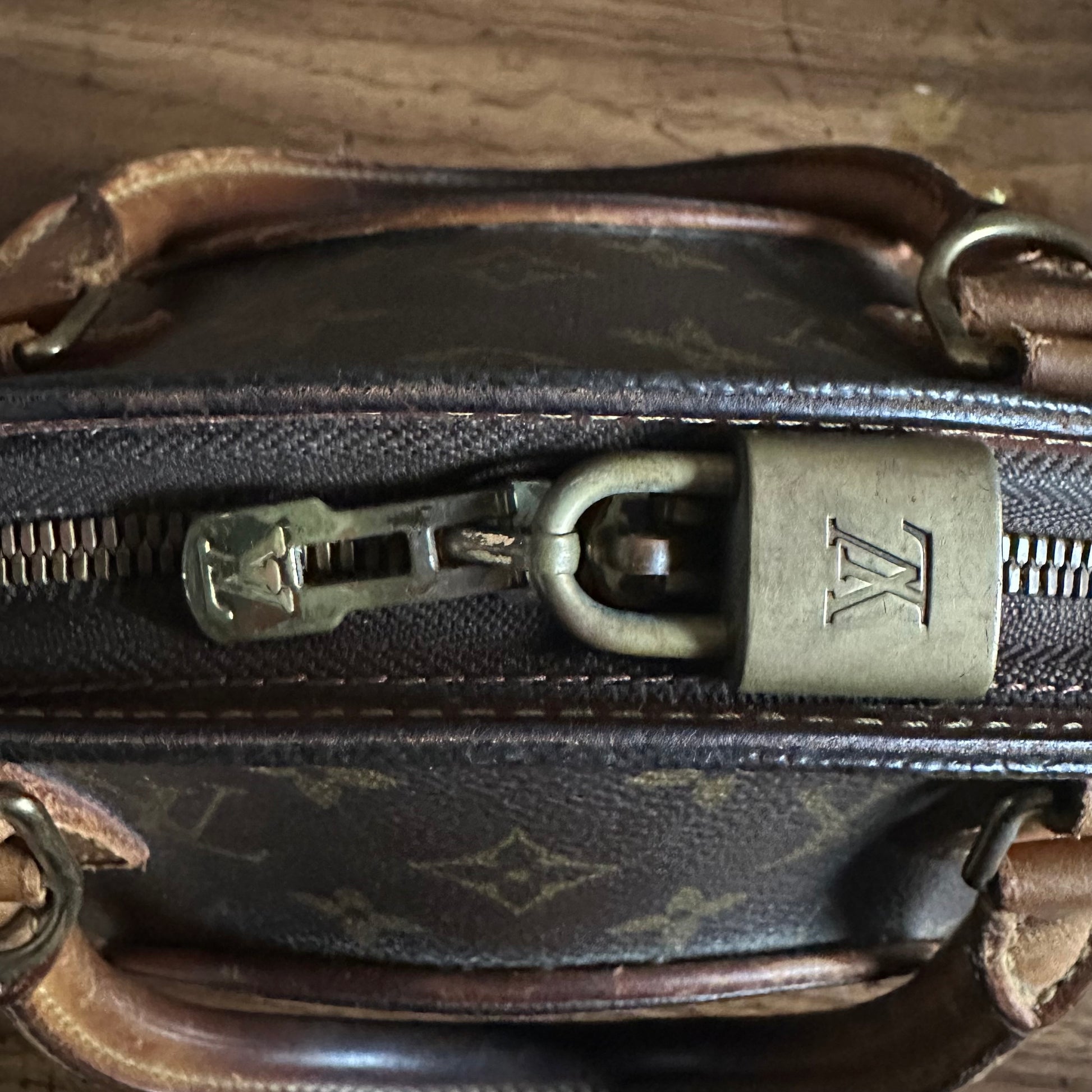 Vintage Louis Vuitton Ellipse PM Bag is monogram coated canvas with leather trim and brass hardware, and has leather double handles, the original padlock and a zipper closure. This bag was made in France in 1997.