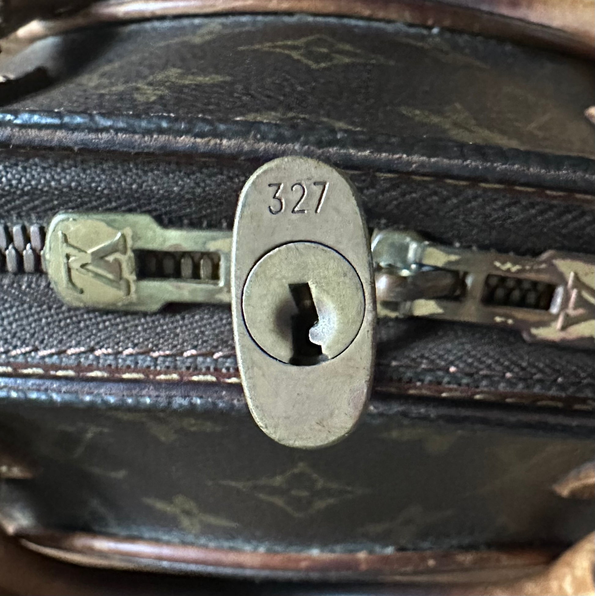 PLEASE NOTE: There are some repair marks along the sides of the zipper, and some normal wear and darkening throughout the leather trim and handles (refer to pics). There are a couple minor spots on the inside of the bag. This bag comes with the original padlock but not the key. This is a vintage, pre-owned item with basic wear and fade. Please refer to the pictures and size measurements.