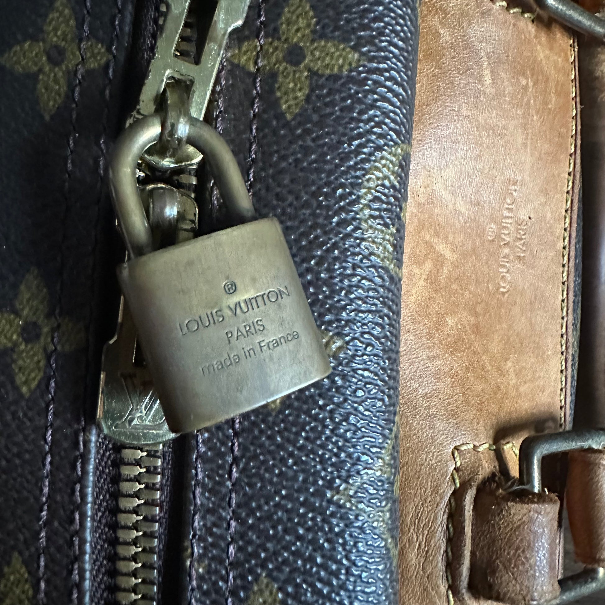 PLEASE NOTE: The date code has worn off of the leather tag, which is common for vintage Deauville bags. There is normal wear throughout the leather trim, including scratches, rubbing and darkening, and a repair mark on the leather attachment to the back handle (refer to pics). The original Louis Vuitton padlock is included without the key. The interior of the bag is very clean. This is a vintage, pre-owned item with basic wear and fade. Please refer to the pictures and size measurements.